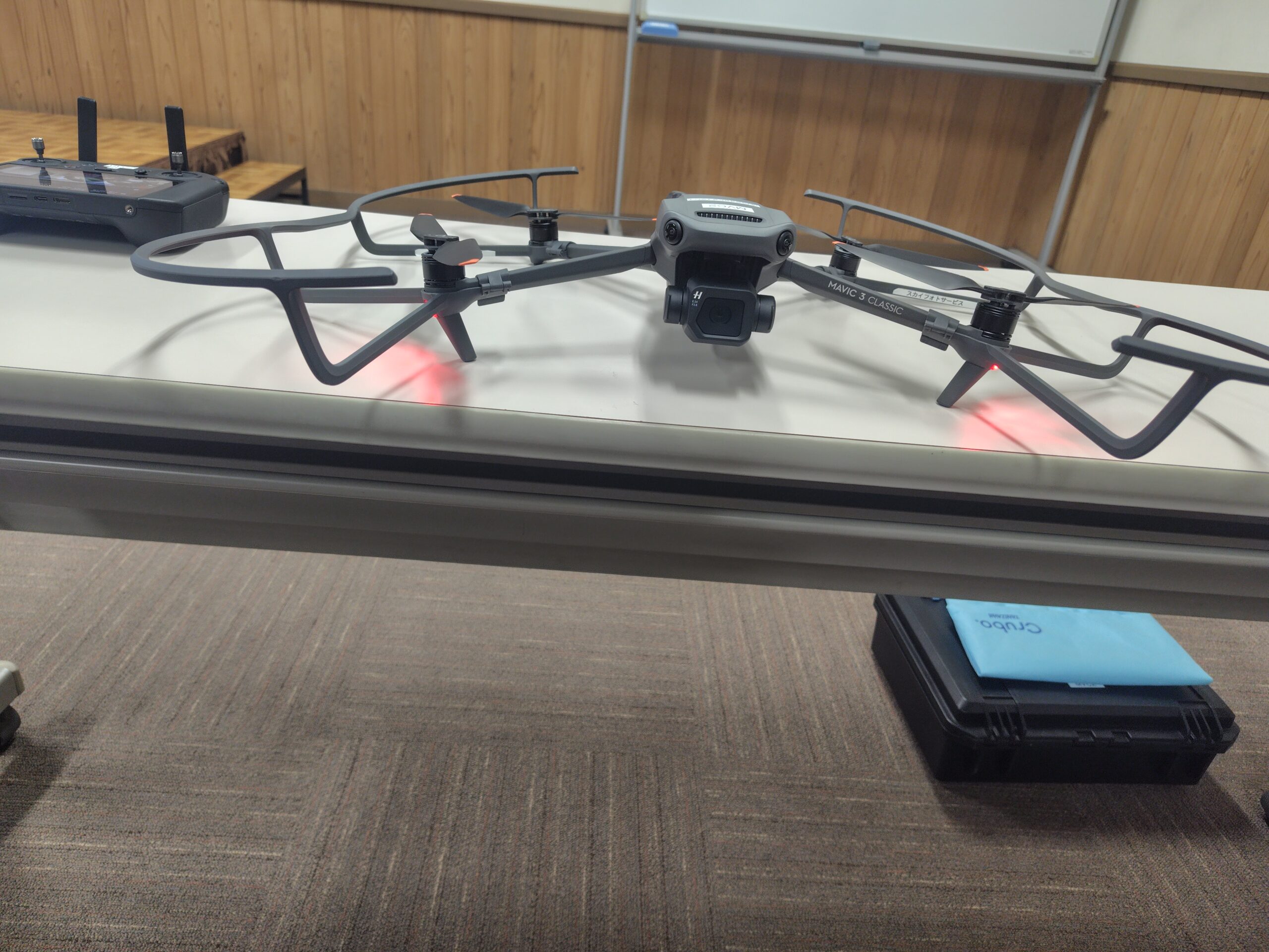 前方のスクリーン横には、実際のドローンが置かれていました。